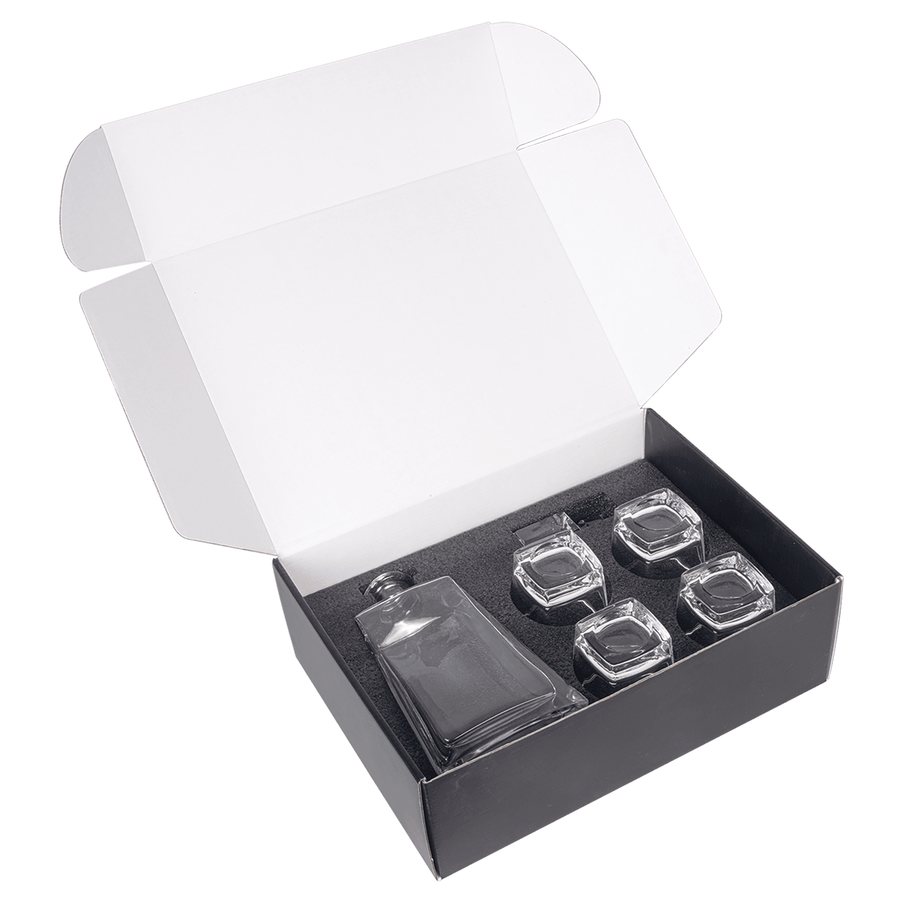 Impress with this 750 mL decanter set featuring a 12" glass decanter and four 8 oz glasses. Perfect for personalization with laser engraving or UV printing, making it an unforgettable gift or display piece.