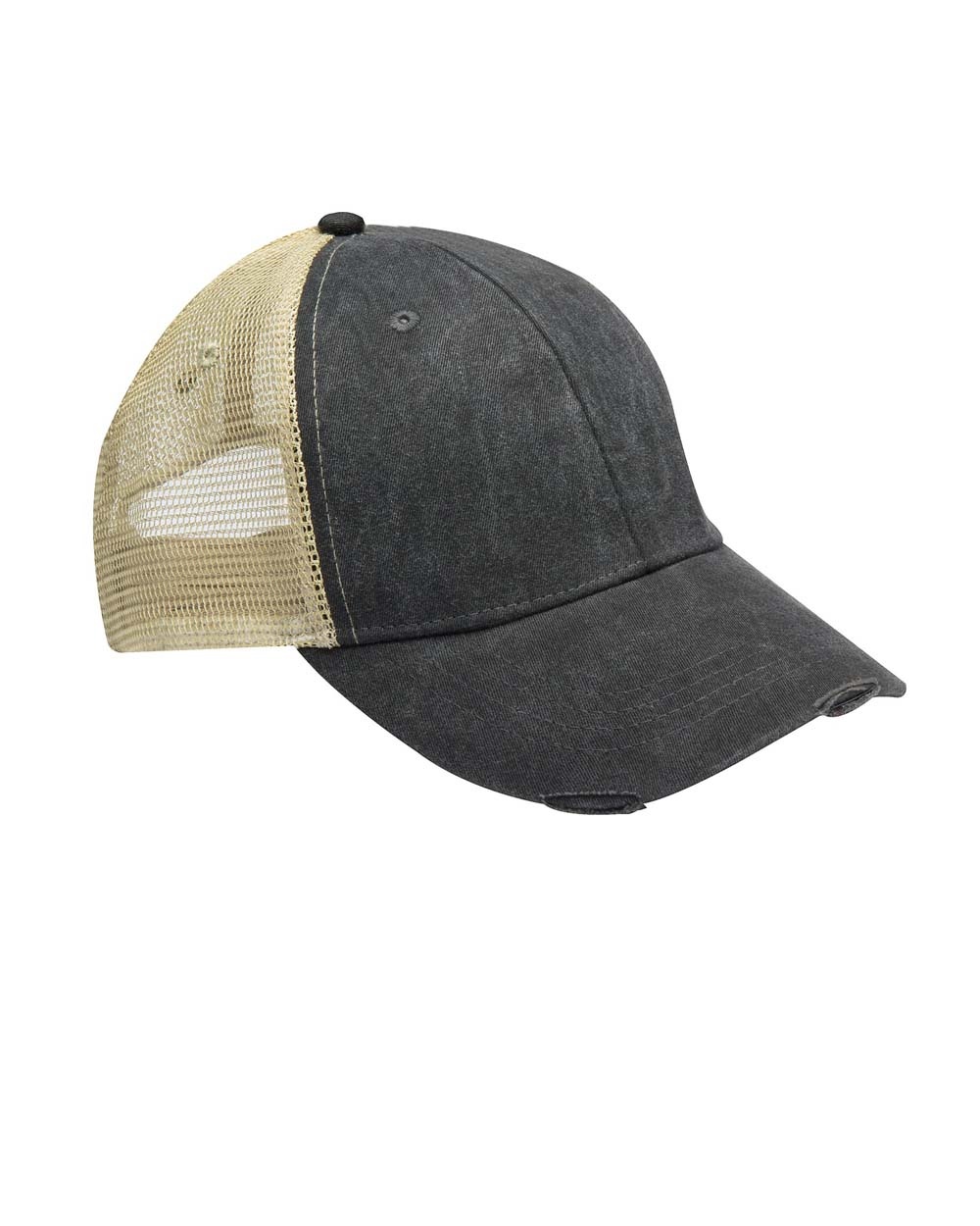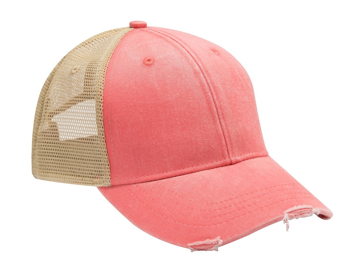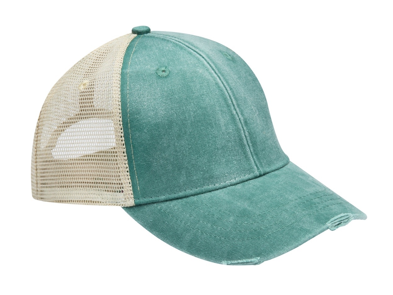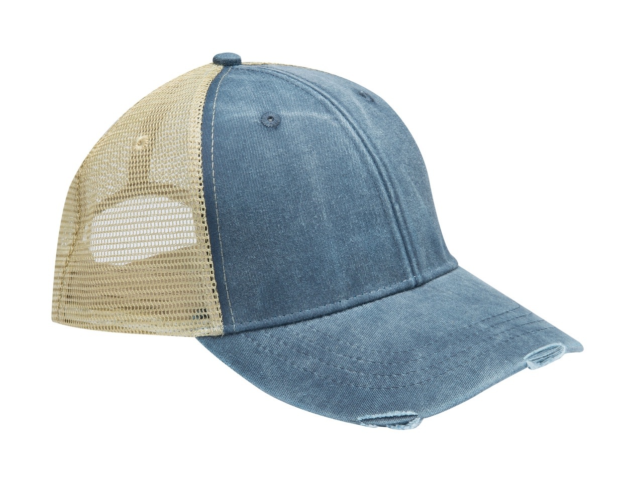 The Adams OL102 Distressed Ollie Cap delivers worn-in cool with pigment-dyed cotton front panels, a mesh back for breathability, a distressed torn visor, four-row stitching, and an adjustable tab closure — one size fits most.