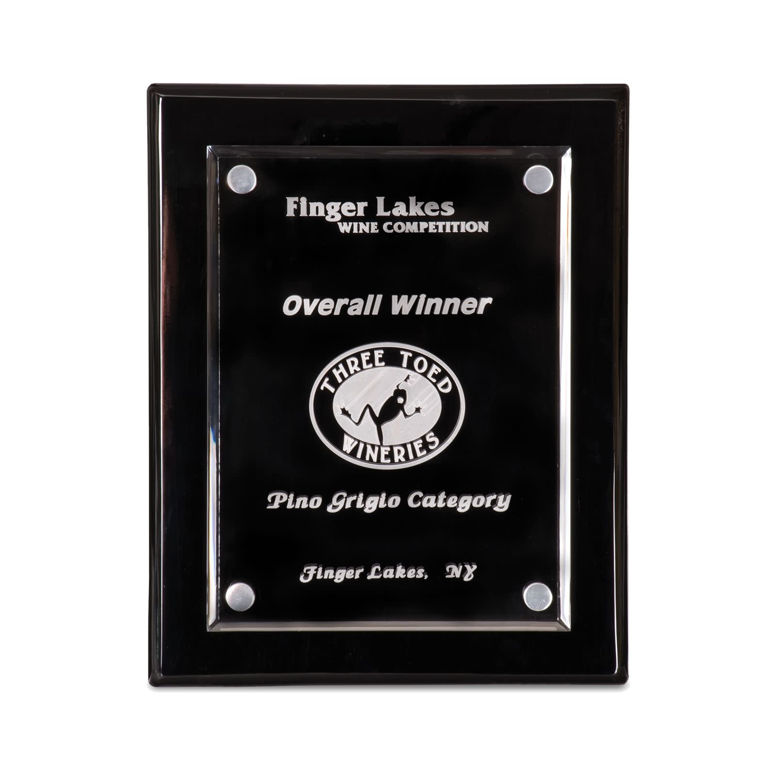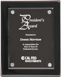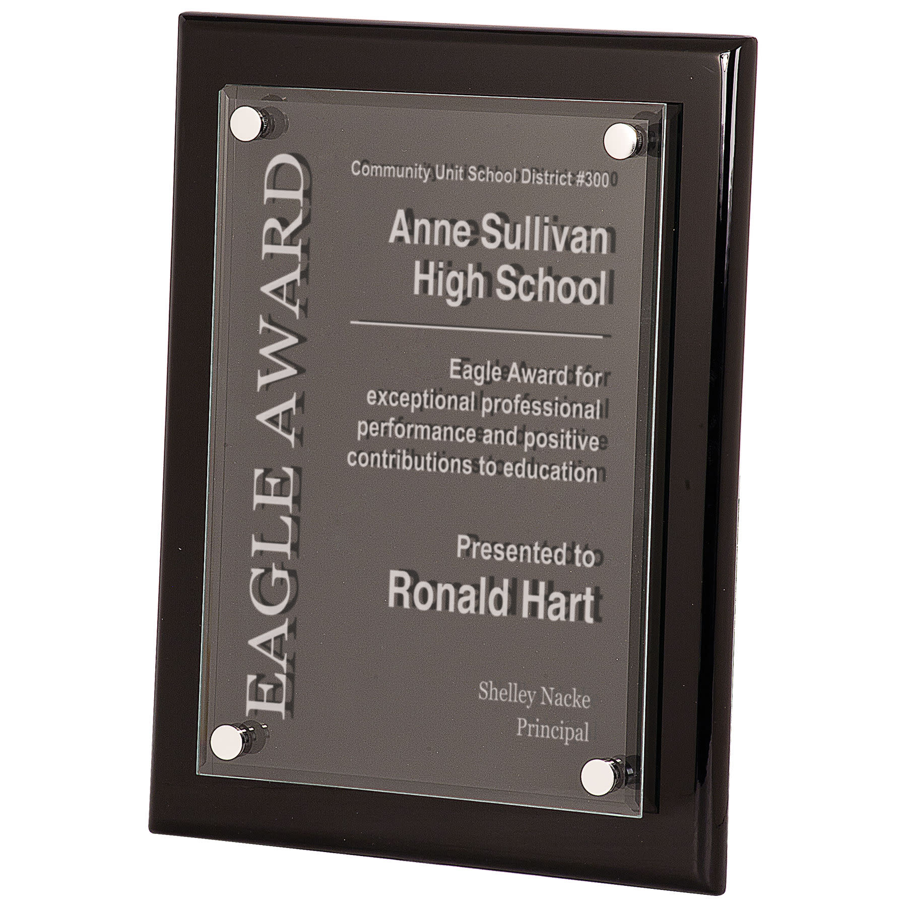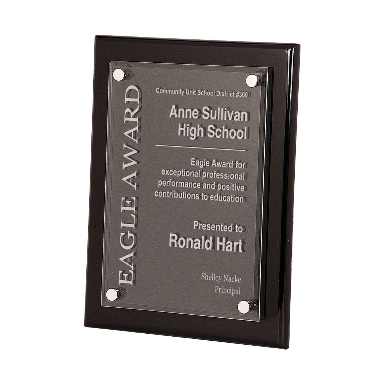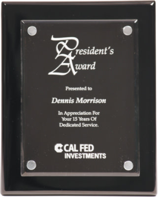 Piano Finish Floating Acrylic Plaques feature a 3/16 inch thick acrylic blank suspended above the plaque using attached hardware.